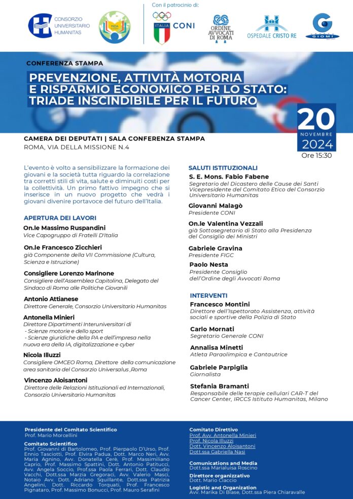 Mercoledì 20 novembre 2024, alle ore 15.30, a Roma, alla Camera dei Deputati, si terrà l’evento sul tema “Prevenzione, attività motoria e risparmio economico per lo Stato: triade inscindibile per il futuro”. L’iniziativa, promossa dal Consorzio universitario Humanitas, di cui il Presidente del Comitato etico Sua Em. Card. Marcello Semeraro Prefetto al Dicastero dei Santi, e con il patrocinio del Coni, dell’Associazione Scientifica Mida Academy, dell’Ordine degli Avvocati di Roma, dell’Ospedale Cristo Re di Roma e del Gruppo Giomi, si pone l’obiettivo di promuovere una maggiore consapevolezza sociale e giovanile sui benefici che un corretto stile di vita e l’attività fisica possono portare non solo alla salute individuale, ma anche alla sostenibilità economica del Paese.