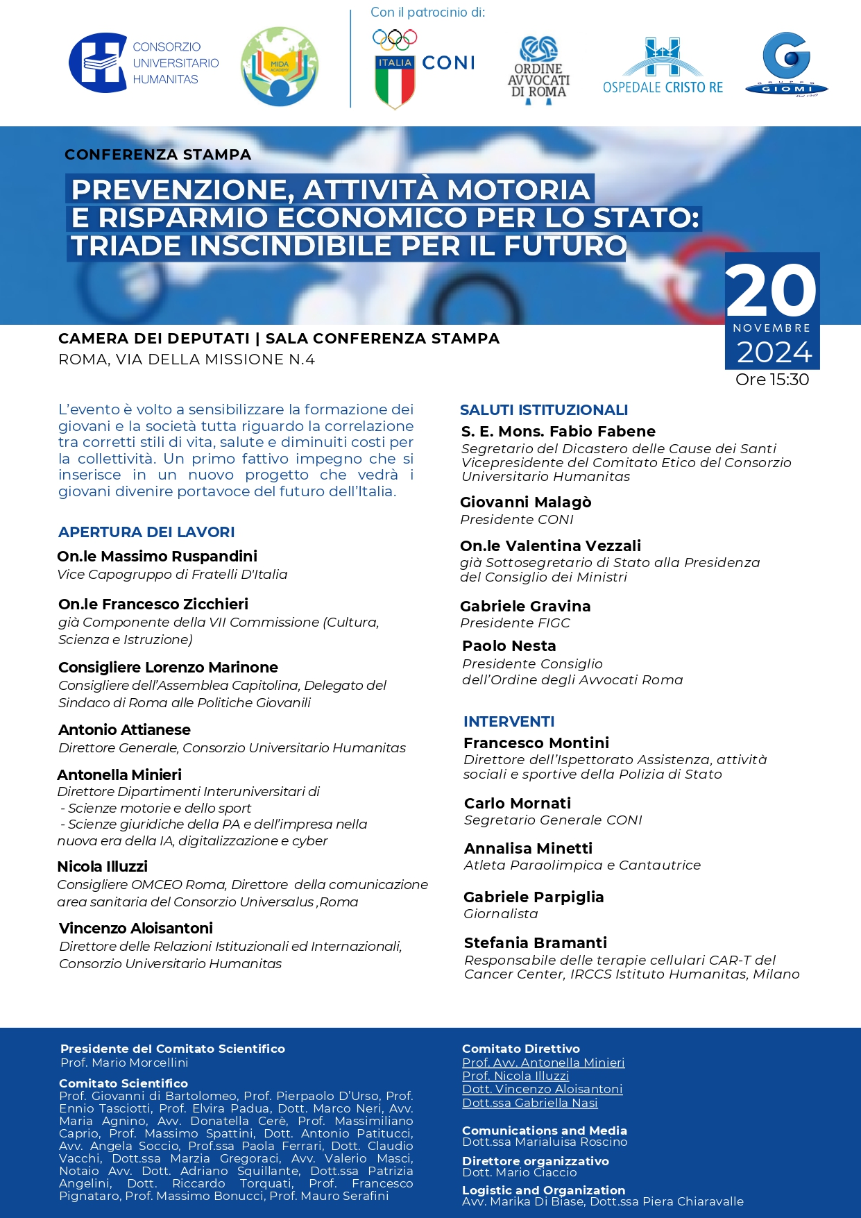 L’apertura dei lavori sarà affidata all’On.le Massimo Ruspandini, che sin da subito ha sostenuto l’idea di suddetta iniziativa e all’On.le Francesco Zicchieri, già Componente della VII Commissione (Cultura, Scienza e Istruzione), al consigliere dell’Assemblea Capitolina e delegato alle politiche giovanili, Lorenzo Marinone, al Direttore Generale del Consorzio Universitario Humanitas, Antonio Attianese, al Direttore Dipartimenti Interuniversitari del Consorzio Humanitas in Scienze motorie e dello sport e Scienze giuridiche della PA e dell’impresa nella nuova era della IA, digitalizzazione e cyber, Antonella Minieri, al Consigliere OMCEO Roma e Direttore della comunicazione area sanitaria del Consorzio Universalus, Nicola Illuzzi, nonché al Direttore delle Relazioni Istituzionali ed Internazionali, Consorzio Universitario Humanitas, Vincenzo Aloisantoni.