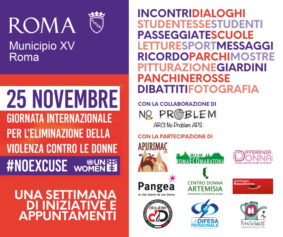 “Non una sola giornata per parlare di violenza sulle donne e non una sola iniziativa di sensibilizzazione. Come ormai da tre anni, per la Giornata internazionale per l’eliminazione della violenza contro le donne, anche quest’anno il Municipio XV accende i riflettori sul 25 novembre con un calendario ricco di appuntamenti diffusi sul territorio dal 22 al 30 novembre.