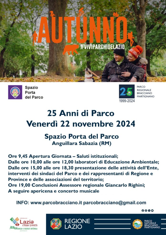 L’ente di gestione del Parco Naturale Regionale Bracciano-Martignano festeggia i primi 25 anni di vita. L’occasione è una festa pensata ad  Anguillara Sabazia (Roma) per oggi, venerdì 22 Novembre 2024, dove simbolicamente verranno spente le 25 candeline dell’ente regionale di tutela ambientale dell’area naturale lacustre, istituito con Legge n. 36 della Regione Lazio promulgata il 25 Novembre del 1999. L’evento è organizzato a Spazio Porta del Parco, tra gli invitati Giancarlo Righini, Assessore Bilancio, Programmazione economica, Agricoltura e sovranità alimentare, Caccia e Pesca, Parchi e Foreste della Regione Lazio, accompagnato da Tiziana Pepe Esposito, Commissario straordinario dell’ente che, insieme al direttore Daniele Badaloni, faranno gli onori di casa.