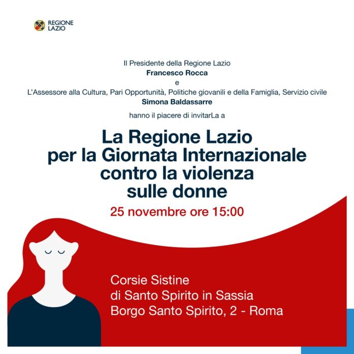 Lunedì 25 novembre, alle ore 15, presso le Corsie Sistine di Santo Spirito in Sassia (Roma, Borgo Santo Spirito 2), il presidente della Regione Lazio, Francesco Rocca, e l’assessore alla Cultura, alle Pari Opportunità, alle Politiche giovanili e della Famiglia, al Servizio civile della Regione Lazio, Simona Baldassarre, celebrano la “Giornata Internazionale contro la violenza sulle donne”.