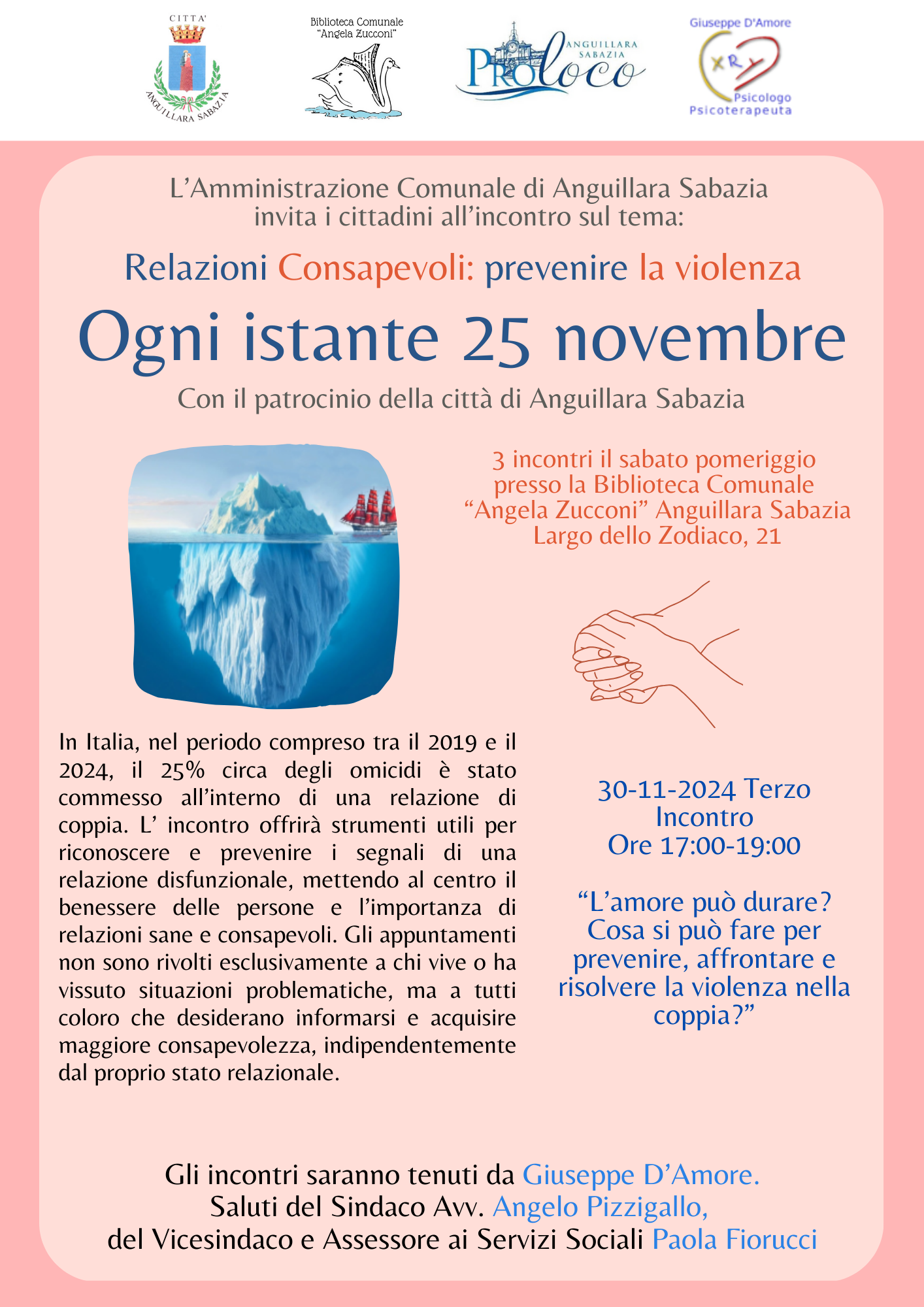 Riceviamo e pubblichiamo – L’amministrazione comunale di Anguillara Sabazia vi invita a partecipare al terzo e ultimo appuntamento del ciclo di incontri “Ogni Istante 25 novembre”, un progetto curato e realizzato dallo psicologo Dr. Giuseppe D’Amore, dedicato alla prevenzione e alla sensibilizzazione contro la violenza nelle relazioni di coppia.