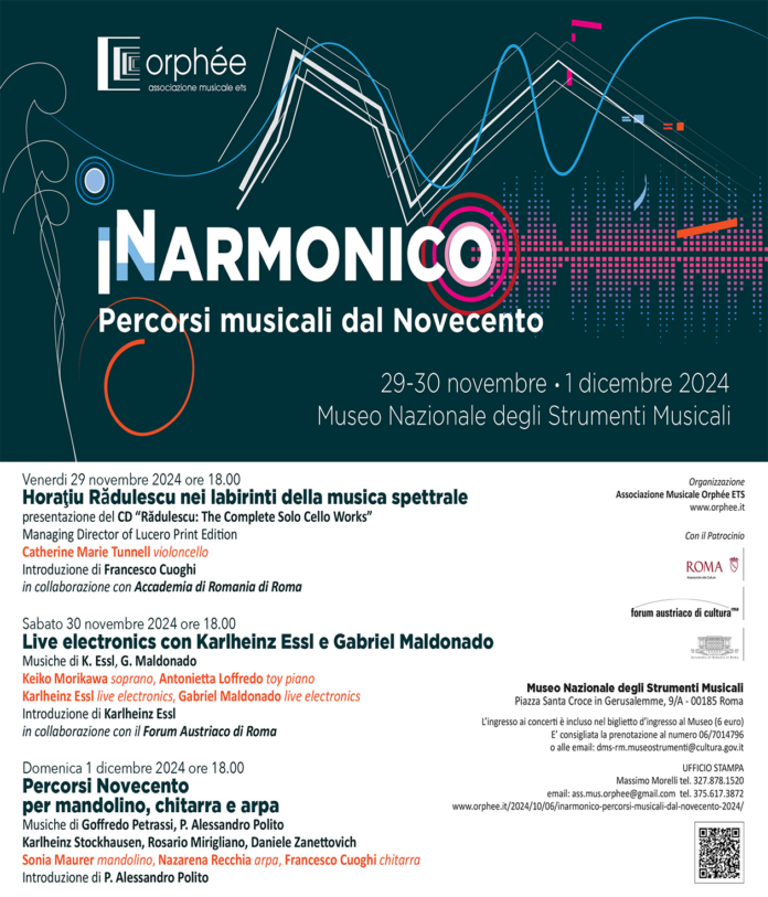 E’ alle viste “inArmonico”, in programma dal 29 novembre al primo giorno di dicembre al Museo nazionale degli strumenti musicali di Roma. Promossa da Francesco Cuoghi, la rassegna vedrà la partecipazione della violoncellista Catherine Marie Tunnell che presenterà ed eseguirà il repertorio al violoncello di Horatiu Radulescu, condensato in una pubblicazione per Mode R. del 2019 (è Radulescu: The Complete Solo Cello Works). Tunnell è la più profonda conoscitrice della musica del compositore rumeno, musica che per formazione e dinamiche ancora oggi contiene uno stimolo fortissimo alla scoperta: l’incontro è il frutto di una collaborazione con l’Accademia di Romania a Roma.
