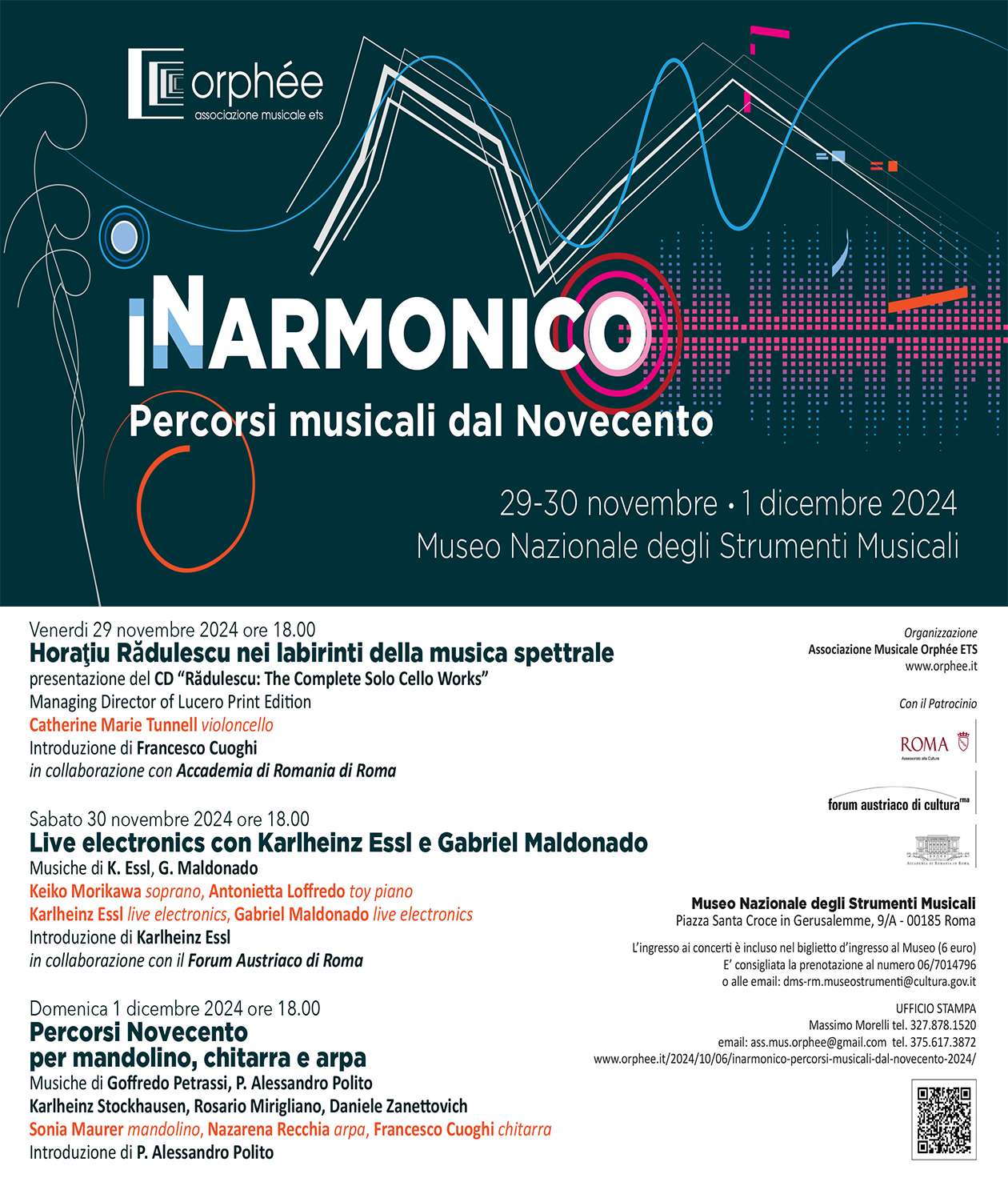 Gli altri incontri in programma sono un concerto con musiche di Karlheinz Essl e Gabriel Maldonado (in collaborazione con il Forum Austriaco di Roma), con importanti composizioni per voce, toy piano e live electronics dei compositori citati e un concerto per arpa, chitarra e mandolino che esplora il repertorio contemporaneo del Novecento di questa combinazione strumentale (musiche di Petrassi, Stockhausen, Polito, etc.).