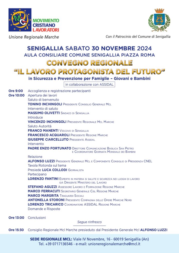 “Il lavoro protagonista del futuro” è il titolo del convegno promosso dal Movimento Cristiano Lavoratori in programma sabato 30 novembre, a partire dalle ore 9, a Senigallia (Ancona), nella sala consiliare in Piazza Roma.