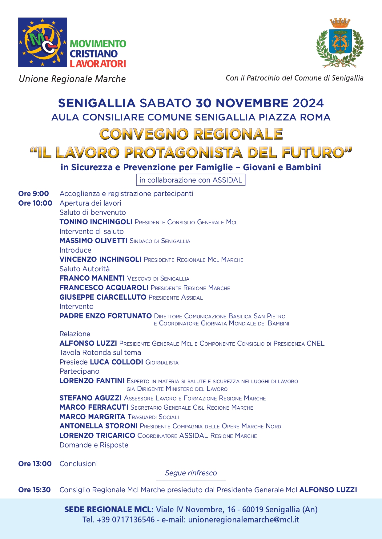 Dopo il saluto di benvenuto del Presidente del Consiglio Generale MCL, Tonino Inchingoli, e l’intervento introduttivo del Sindaco di Senigallia, Massimo Olivetti, seguiranno gli interventi del presidente regionale di MCL Marche, Vincenzo Inchingoli, del Vescovo di Senigallia, Franco Manenti, del presidente della Regione Marche, Francesco Acquaroli e del Presidente di Assidal, Giuseppe Ciarcelluto.