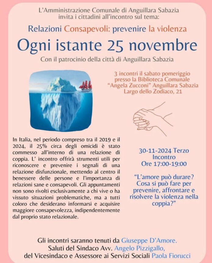 Sabato 30 novembre, alle ore 17, nella Biblioteca Comunale “Angela Zucconi” in Largo dello Zodiaco 21, si terrà il terzo incontro della rassegna “Relazioni consapevoli: prevenire la violenza – Ogni istante 25 novembre” patrocinato dal Comune di Anguillara Sabazia.