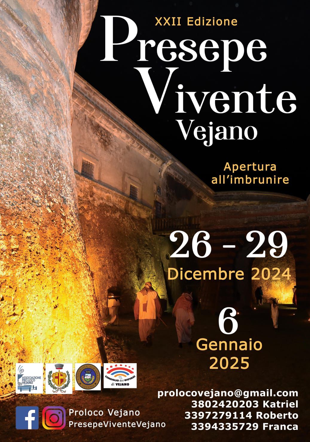 Il Natale di Vejano fa letteralmente i numeri per stupirvi anno dopo anno! 250 sono i figuranti, 800 sono i metri di percorso da seguire e in cui emozionarsi. Tutto il paese Γ¨ coinvolto nell’organizzazione del Presepe Vivente piΓΉ autentico della Tuscia. Il 26 e 29 dicembre, e il 6 gennaio Γ¨ qui che va in scena la 22esima edizione dello βspettacolo natalizioβ piΓΉ coinvolgente del viterbese. La prima volta fu nel 2001, con i bimbi dellβasilo di Vejano.