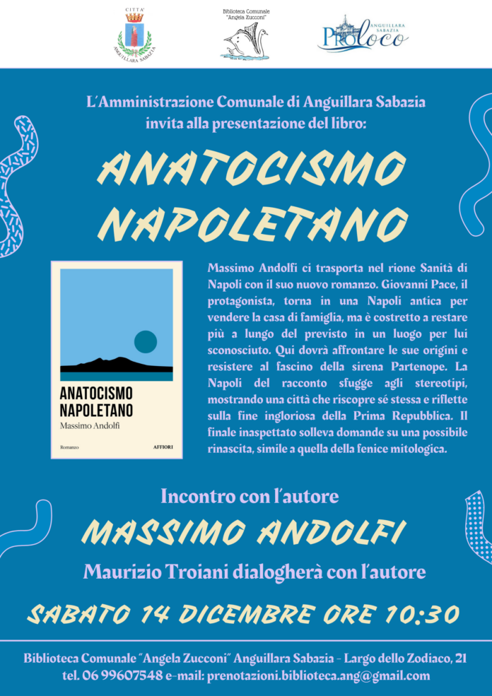 L’Amministrazione Comunale di Anguillara Sabazia invita alla presentazione del libro “ANATOCISMO NAPOLETANO”, il nuovo romanzo di MASSIMO ANDOLFI.