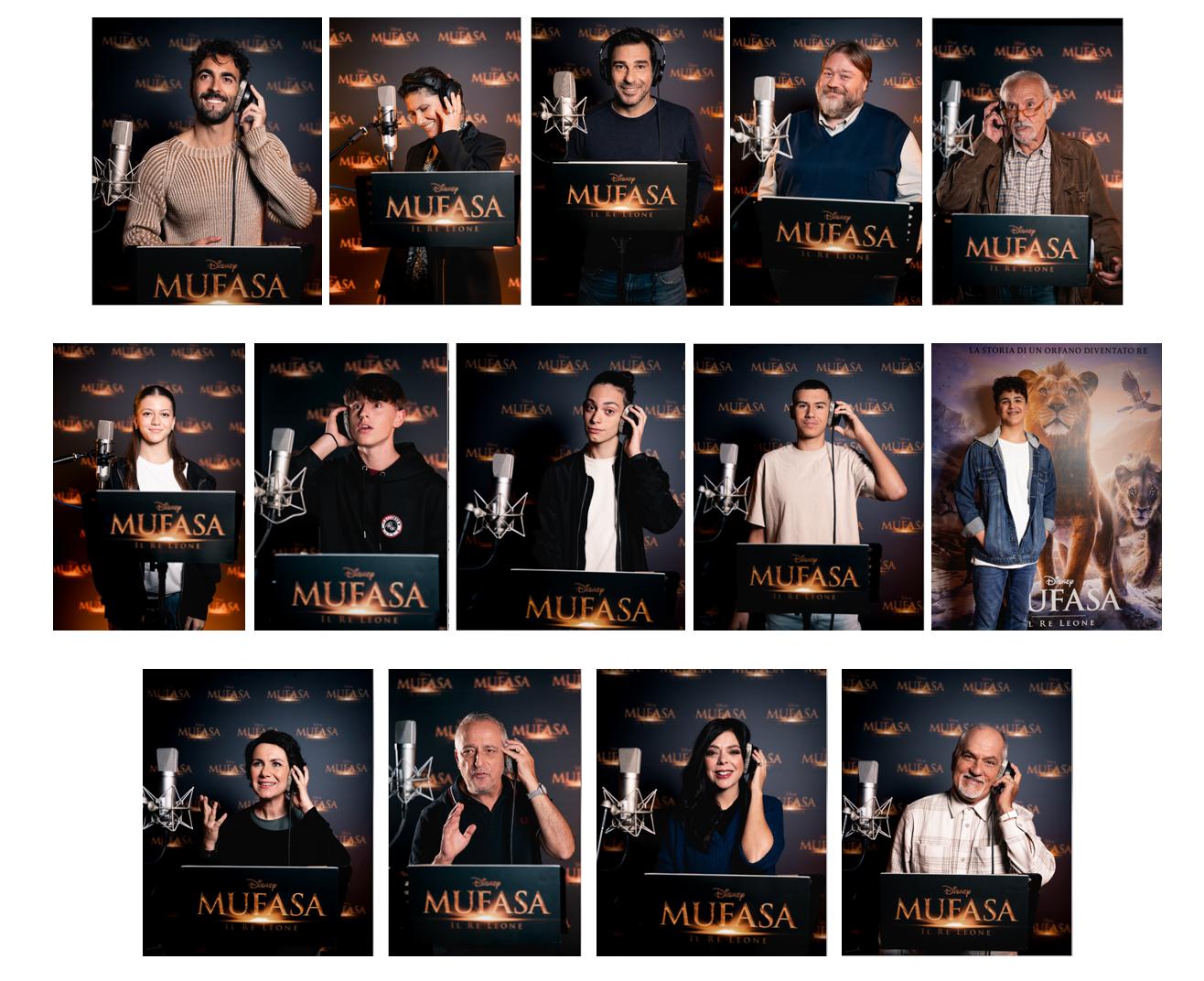 Luca Marinelli è Mufasa, Alberto Boubakar Malanchino è Taka, Elodie è Sarabi, Edoardo Stoppacciaro è il giovane Rafiki, Riccardo Suarez Puertas è Zazu, Dario Oppido è Kiros, un incredibile leone con grandi progetti per il suo branco, Toni Garrani è Rafiki in versione adulta, Stefano Fresi è Pumbaa, Edoardo Leo è Timon, Marco Mengoni è Simba, Elisa Toffoli è Nala, Emma Cecile Rigonat è Kiara, la figlia di re Simba e della regina Nala, Mattia Moresco (dialoghi) e Adriano Trio (canzoni), interpretano Mufasa cucciolo, Valeriano Corini (dialoghi) e Edoardo Veroni (canzoni), interpretano Taka cucciolo, Daniela Calò è Eshe, la madre di Taka, Pasquale Anselmo è Obasi, il padre di Taka, Domitilla D’Amico (dialoghi) e Karima (canzoni) interpretano Afia, la madre di Mufasa, Eugenio Marinelli è Masego, il padre di Mufasa.