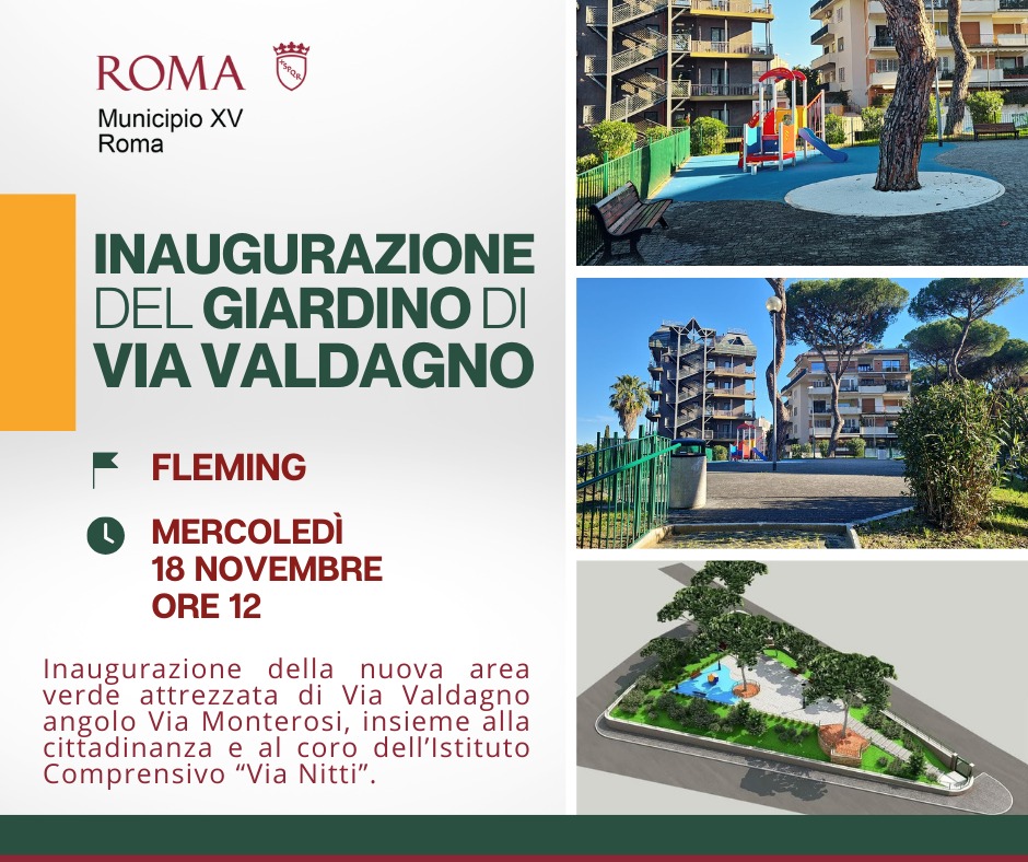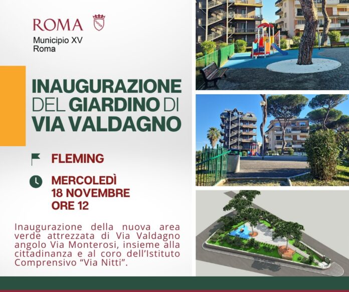 “Dopo i lavori effettuati, aprirà domani alle 12.00 l’area verde di via Valdagno angolo via Monterosi al Fleming. Avviati a maggio scorso, gli interventi di manutenzione straordinaria del parco sono stati richiesti dal Municipio e a cura del Dipartimento Tutela Ambiente, che ringraziamo insieme all’Assessora capitolina Sabrina Alfonsi per la sensibilità dimostrata.