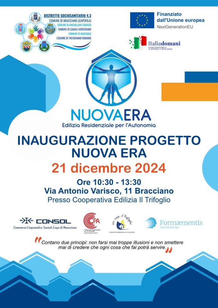 Sabato 21 dicembre 2024, alle ore 10:30, presso Via Antonio Varisco 11 a Bracciano, si terrà l’inaugurazione ufficiale del progetto PNRR “Nuova ERA – Residenzialità e Autonomia”, un’iniziativa rivoluzionaria nata per offrire percorsi di autonomia e inclusione a persone con disabilità del Distretto 4.3 residenti nei Comuni di Bracciano, Anguillara, Manziana, Trevignano e Canale Monterano.
