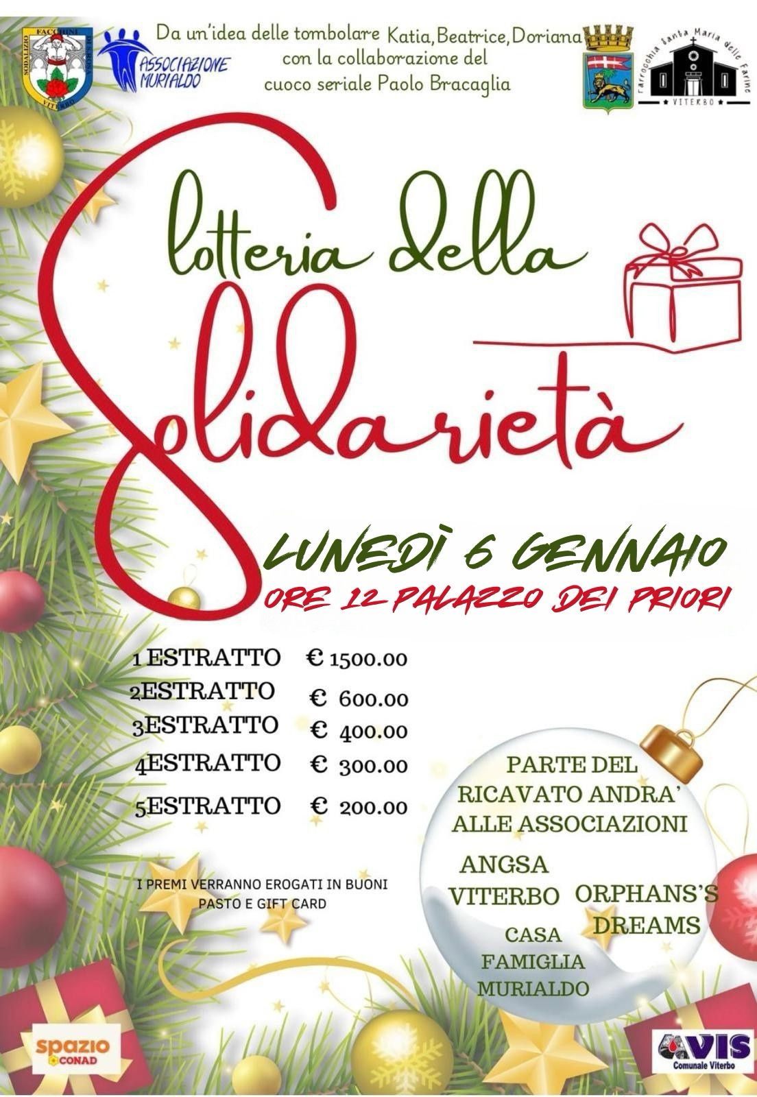 “La Lotteria della Solidarietà è un’iniziativa che non solo coinvolge la comunità di Viterbo, ma contribuisce concretamente a sostenere le persone più vulnerabili della nostra città – ribadisce l’assessore alle politiche sociali e all’educazione Rosanna Giliberto -. Grazie alla partecipazione delle realtà associative siamo riusciti a creare un’opportunità di speranza e solidarietà che fa crescere il senso di appartenenza e responsabilità verso gli altri”. I premi verranno erogati in buoni pasto e gift card. Parte del ricavato sarà devoluto alle associazioni Angsa Viterbo, Casa famiglia Murialdo e Orphans’s Dreams. L’estrazione avverrà alla presenza della sindaca Frontini, dell’assessore Giliberto e dei rappresentanti delle realtà che hanno organizzato l’iniziativa e di tutti coloro che vorranno partecipare. L’evento è aperto al pubblico.