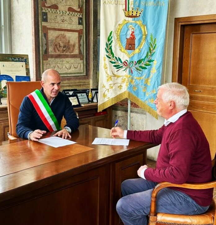Un simpaticissimo Sindaco, l’avvocato Angelo Pizzigallo, nato il 20 marzo 1983, eletto primo cittadino di Anguillara Sabazia, il sindaco più giovane eletto in questa città, mi accoglie sorridente a braccia aperte e, prima ancora di iniziare l’intervista, mi invita a godere dello spettacolo che lo circonda: non solo tecnici, amministrativi e assessori gentili e sorridenti al lavoro nei vari uffici, non solo gli affreschi che lasciano senza fiato per la perfetta fattura, non solo lo splendido gonfalone realizzato a mano da dolcissime suore, ma soprattutto la natura che si osserva dalle vetrate delle arcate, un tempo aperte, che si declina in un meraviglioso ed incantevole lago coronato da boschetti che affascina con i suoi colori intensi, vivaci e ammalianti.