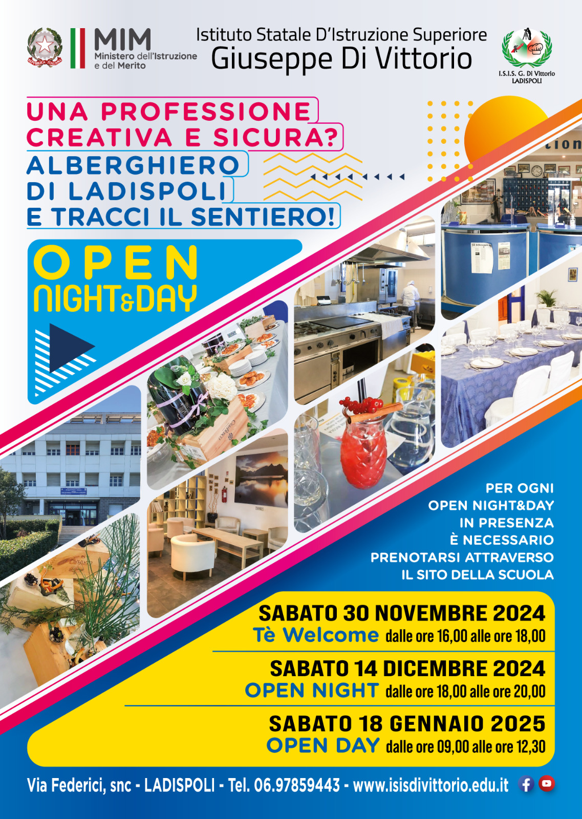 Utilizzando le più moderne metodologie e strategie didattiche e avvalendosi di una consolidata rete di rapporti con le aziende del territorio, l’Alberghiero di Ladispoli offre tre indirizzi di studio: Enogastronomia (con l’Opzione in Prodotti dolciari artigianali e industriali), Servizi di Sala e Vendita, Accoglienza Turistica.
