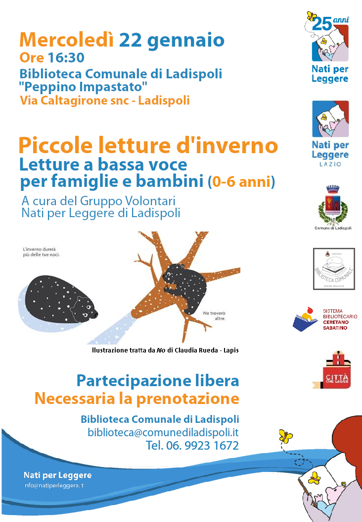 In biblioteca primo appuntamento dell’anno di “Nati per leggere”, le letture a bassa voce per bambini da 0 a 6 anni a cura del Gruppo Volontari Nati per Leggere di Ladispoli.