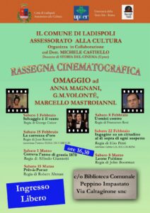 Da sabato 25 gennaio, presso la Biblioteca Comunale “Peppino Impastato”, si terrà una prestigiosa rassegna cinematografica dedicata a tre icone del cinema italiano: Anna Magnani, Gian Maria Volonté e Marcello Mastroianni. Un piccolo omaggio sarà dedicato a Sophia Loren con due brevi corti in coppia con Mastroianni .