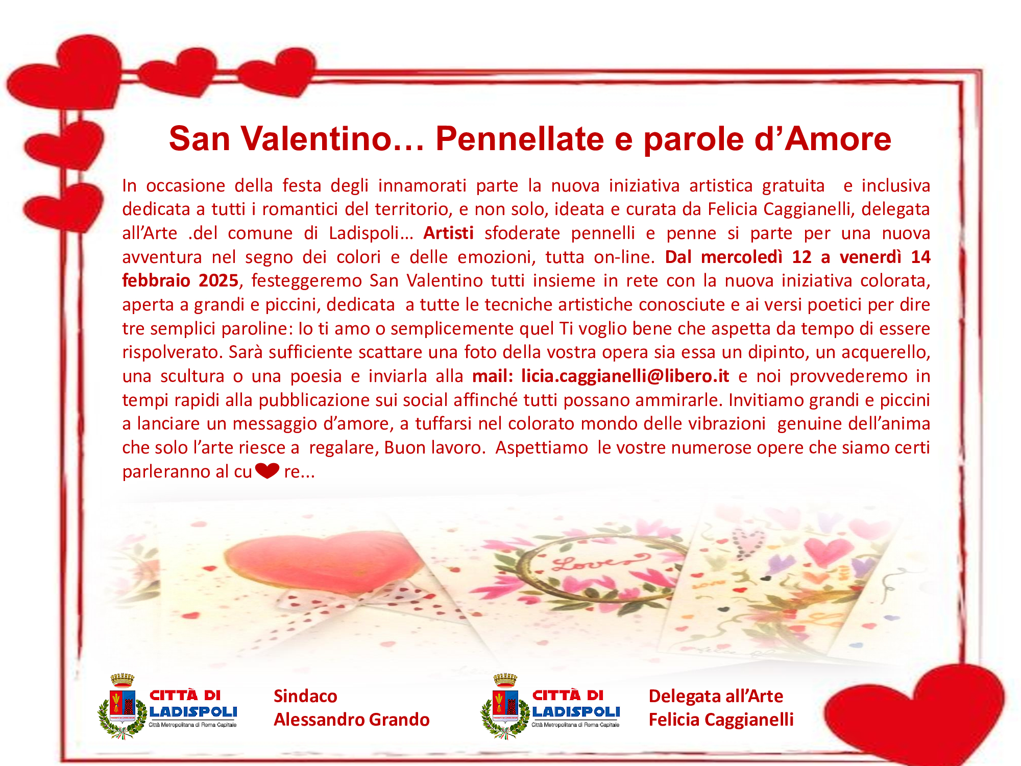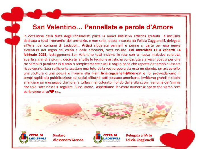 “Il progetto – afferma Felicia Caggianelli, delegata all’Arte del comune di Ladispoli – nasce con l’obiettivo di coinvolgere i cittadini ad esprimere le proprie emozioni attraverso le opere. Dal mercoledì 12 a venerdì 14 febbraio festeggeremo San Valentino tutti insieme sul web con la nuova iniziativa colorata, aperta a grandi e piccini, dedicata a tutte le tecniche artistiche conosciute e ai versi poetici per dire tre semplici paroline: Io ti amo o semplicemente quel Ti voglio bene che aspetta da tempo di essere rispolverato. Sarà sufficiente scattare una foto della propria opera, sia essa un dipinto, un acquerello, una scultura o una poesia e inviarla alla mail licia.caggianelli@libero.it. Sarà pubblicata sui social affinché tutti possano ammirarla. Invitiamo grandi e piccini a lanciare un messaggio d’amore, a tuffarsi nel colorato mondo delle vibrazioni genuine dell’anima che solo l’arte riesce a regalare. Aspettiamo le opere che siamo certi parleranno al cuore. Artisti sfoderate pennelli, matite e penne, si parte per una nuova avventura nel segno dei colori e delle emozioni, tutta on line”.