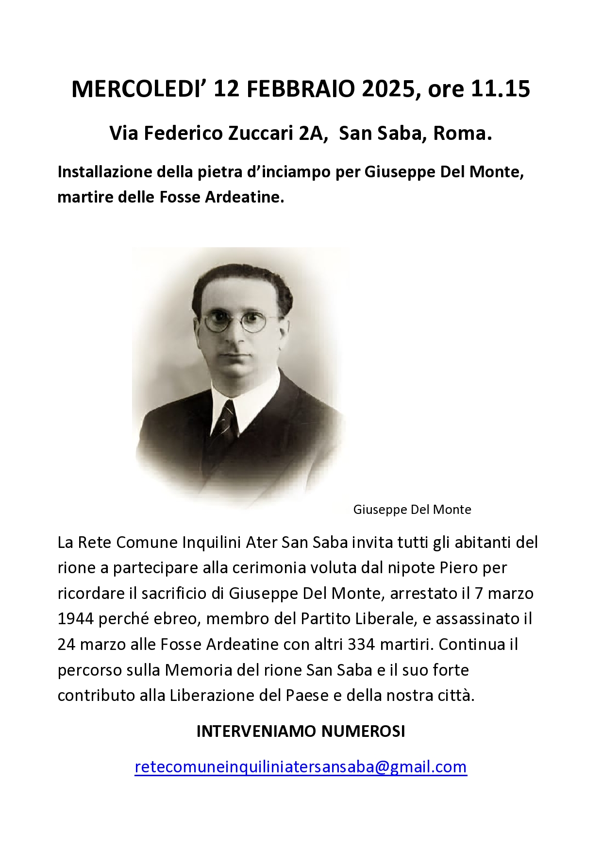 Oggi in via Federico Zuccari 2A, si è proceduto all’ installazione di una pietra d’inciampo in memoria di Giuseppe del Monte ucciso alle Fosse Ardeatine il 24 Marzo 1944.