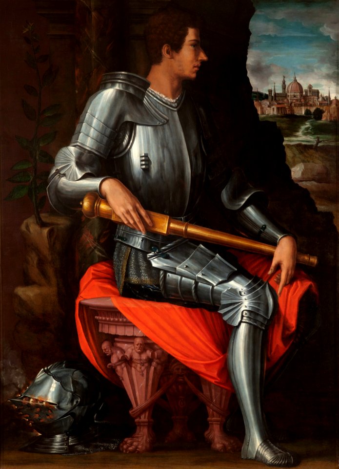 Egli dipinse grandi saloni, soffitti, pale d’altare, eppure nell’opera del 1534, in cui rappresentava il suo protettore, Cosimo I dei Medici che indossa un’armatura in ferro, Vasari stesso espresse umilmente il grande sforzo sostenuto nell’imprimere sulla tela la lucentezza di quel materiale.