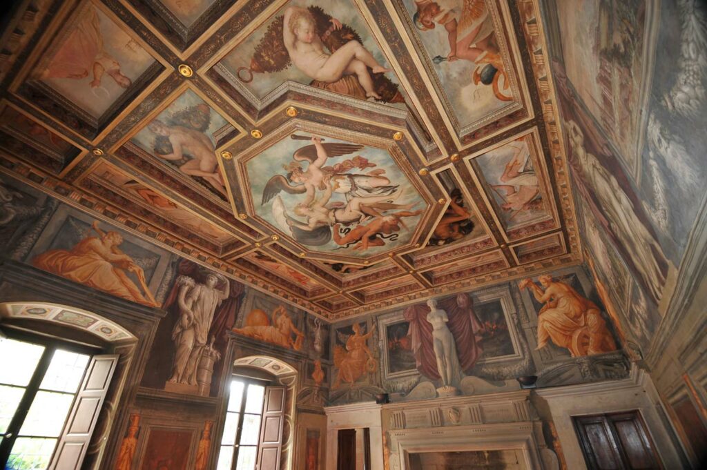 Tuttavia, dal salone dipinto con quattro grandi scene, emergono effetti ottici straordinari: gli ornamenti allegorici, le figure in architettura dipinta con sculture simulate, le pitture nello stile manierista svolgono la narrazione in uno spazio che appare immaginario e reale, dove i gradini che si osservano, pur essendo solo dipinti, danno allo spettatore l’illusione di poter entrare nella scena.