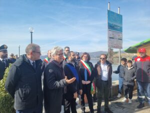 A bordo della motonave Sabazia II, che grazie a Città metropolitana ha ripreso da poco più di un anno la navigazione turistica, quale alternativa ecologica e sostenibile per esplorare l’area lacuale, l’arrivo ai due pontili del Consigliere delegato Ambiente di Città metropolitana di Roma, Rocco Ferraro, assieme Presidente del Consorzio di Navigazione, Francesco Pizzorno, al Capo Segreteria del Sindaco in Città Metropolitana, Emiliano Minnucci, ai Sindaci di Bracciano, Marco Crocicchi, Anguillara Sabazia, Angelo Pizzigallo, al Sindaco e Vicesindaco di Trevignano Romano Claudia Maciucchi e Luca Galloni, oltre alle autorità civili e militari del territorio, per il taglio del nastro inaugurale che ha restituito alle comunità i due pontili interessati dai lavori di riqualificazione.
