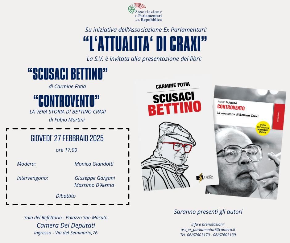 Oggi alle 17 alla Camera dei Deputati, si terrà un evento dedicato alla figura di Bettino Craxi, su iniziativa dell’Associazione Ex Parlamentari della Repubblica, con la presentazione di un volume, edito da HCS Heraion Creative Space srl, contenente due libri che ripercorrono la sua vicenda politica e il suo lascito: “Scusaci Bettino” di Carmine Fotia e “La fiducia” di Antonio Badini e Massimo Caprara. Inoltre, verrà presentato anche il libro “Controvento. La vera storia di Bettino Craxi” di Fabio Martini. L’incontro rappresenta un’occasione per approfondire il ruolo di Craxi nella storia politica italiana e internazionale, con particolare attenzione alla sua visione riformista, ai rapporti tra socialisti e comunisti e al suo impegno sullo scenario globale.