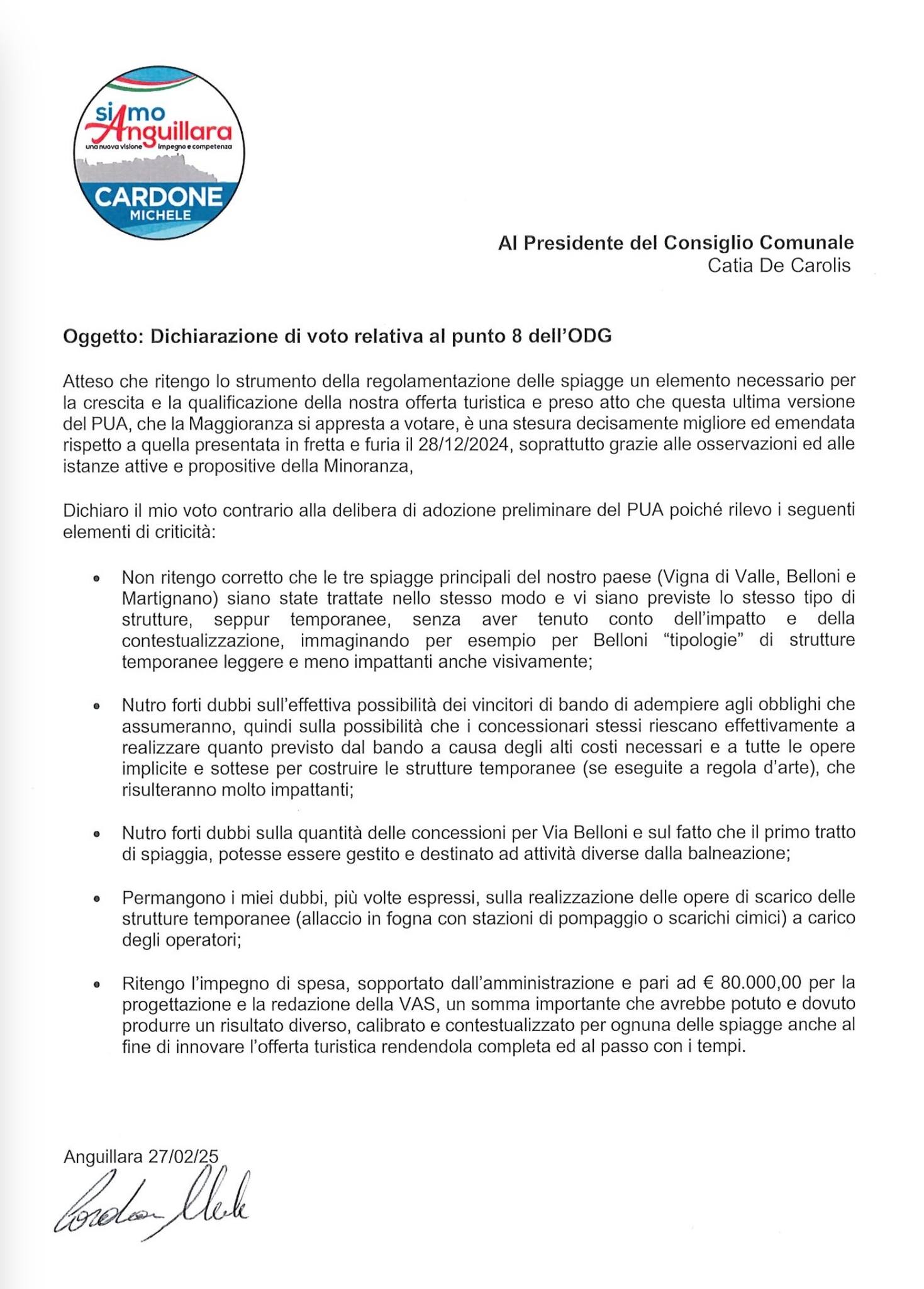 Riceviamo e pubblichiamo – Nel consiglio comunale di Ieri si è votata l’approvazione del tanto discusso P.U.A. (Piano Utilizzo Arenili). Io ho espresso il mio voto contrario non per la tipologia dello strumento, ma nel merito delle scelte di indirizzo fatte. Sono dell’idea che dotarsi di regole sia necessario per un territorio come il nostro, che vuole crescere in maniera strutturata ed attenta, ma proprio perché la scelta di come applicare le regole, da la misura della strada che si intende percorrere, ho trovato queste scelte distanti dalla mia idea.