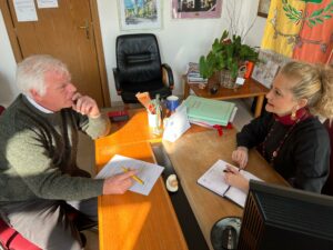 In una mattina di sole splendente, mi accoglie una altrettanto splendente e sorridente sindaco nel suo ufficio in piazza Risorgimento. Un ambiente che richiama dovunque, con poster, foto e repliche estremamente ben eseguite, la cultura che innegabilmente è a fondamento della cittadina di Cerveteri che ha una storia millenaria. Una cultura che va dall’archeologia richiamata dalle immagini stupende della necropoli della Banditaccia e dei famosissimi vasi di Eufronio poste sulle pareti alla storia con foto del centro storico medievale alla presenza musicale con poster che ricordano l’impegno ad livello dalla classica al rock con il calendario delle esibizioni estive di artisti e gruppi di richiamo nazionale e della banda cittadina. Una cultura che viene ritratta anche da immagini di vita dalle sagre, eventi che richiamano cultori dei prodotti tipici del territorio. Insomma si nota la preparazione ed il gusto dell’architetto sindaco, non fosse altro per il vezzo di avere voluto spostare un oggetto di servizio dalla scrivania, per consentire foto migliori.