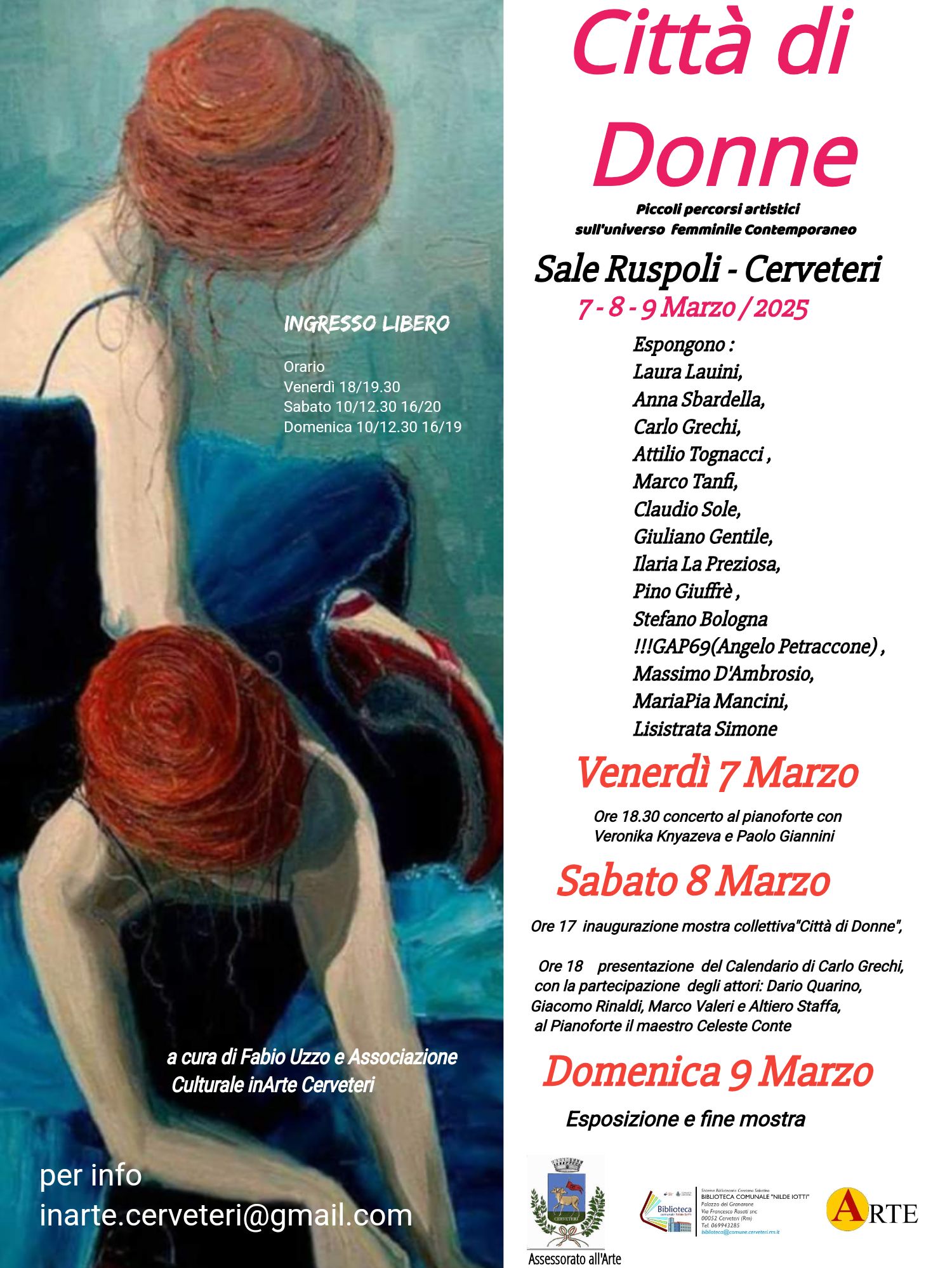 “Come ogni anno, in occasione della Giornata Internazionale della Donna, come Amministrazione comunale abbiamo organizzato una serie di iniziative artistiche e culturali. Una serie di eventi ed appuntamenti durante i quali riflettere sulla condizione della Donna nel mondo e nella storia, sulle conquiste ottenute ma anche su quanto ancora oggi, nel mondo, ci siano molte donne costrette a dover combattere, mettendo anche a repentaglio la propria vita, per poter godere dei diritti più elementari. Tre giorni di eventi, organizzati con il personale della Biblioteca comunale Nilde Iotti, che ringrazio per il supporto e sostegno che sempre garantiscono alle proposte artistiche e culturali della nostra città e la collaborazione preziosa Fabio Uzzo dell’Associazione culturale InArte e che vede la partecipazione di moltissimi artisti del territorio e di Cerveteri. L’ingresso è gratuito e a tutti, l’invito a partecipare per vivere insieme un momento di grande spessore artistico e musicale”. A dichiararlo è Federica Battafarano, Assessore all’Arte e alla Biblioteca del Comune di Cerveteri, che nel presentare l’iniziativa “Città di Donne”, in programma in Sala Ruspoli da venerdì 7 a domenica 9 marzo prosegue: