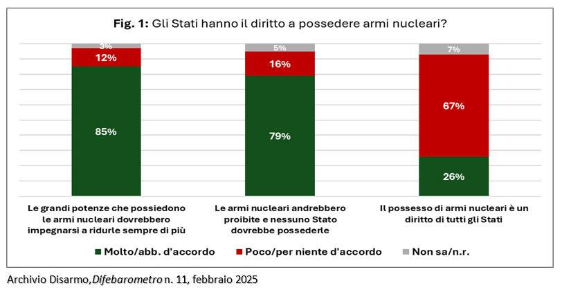 Tutto al contrario, l’85% degli intervistati ritiene che le grandi potenze nucleari dovrebbero impegnarsi a ridurre sempre di più questo tipo di armamenti, come del resto è previsto dal Trattato di non proliferazione (TNP) sottoscritto tra gli altri da Usa, Russia, Cina, Francia e Gran Bretagna. Anzi secondo il 79% dei rispondenti le armi nucleari andrebbero proibite e nessuno Stato dovrebbe possederle. Viceversa solo il 26% crede che il possesso di armi nucleari sia un diritto di tutti gli Stati.