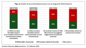 Chiedendo poi il grado di accordo/disaccordo con una serie di affermazioni, ben 2/3 degli intervistati ritiene che la difesa europea dovrebbe basarsi su un modello misto di armi convenzionali e metodi nonviolenti. Su una difesa con armi esclusivamente convenzionali è d’accordo una maggioranza relativa del 46%, mentre sugli arsenali nucleari francese e britannico il campione si divide a metà tra quanti ritengono e quanti escludono che essi siano in grado di dissuadere eventuali aggressioni. Infine, dato più saliente di tutti, l’ipotesi di un’Unione Europea che si doti di armi nucleari proprie trova l’opposizione del 57% degli intervistati.