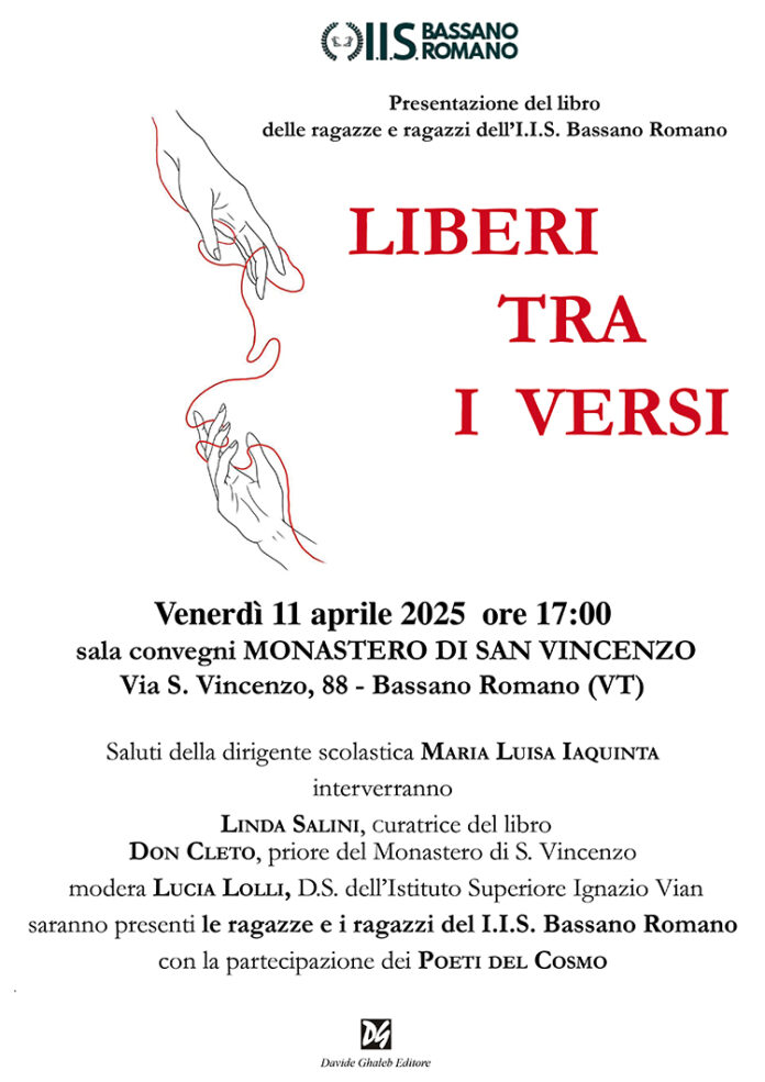 Venerdì 11 aprile 2025, alle ore 17:00, presso la sala convegni del Monastero di San Vincenzo, in via San Vincenzo 8, Bassano Romano (VT), si terrà la presentazione del libro di poesie delle studentesse e degli studenti dell’I.I.S. Bassano Romano, a cura della professoressa Linda Salini.