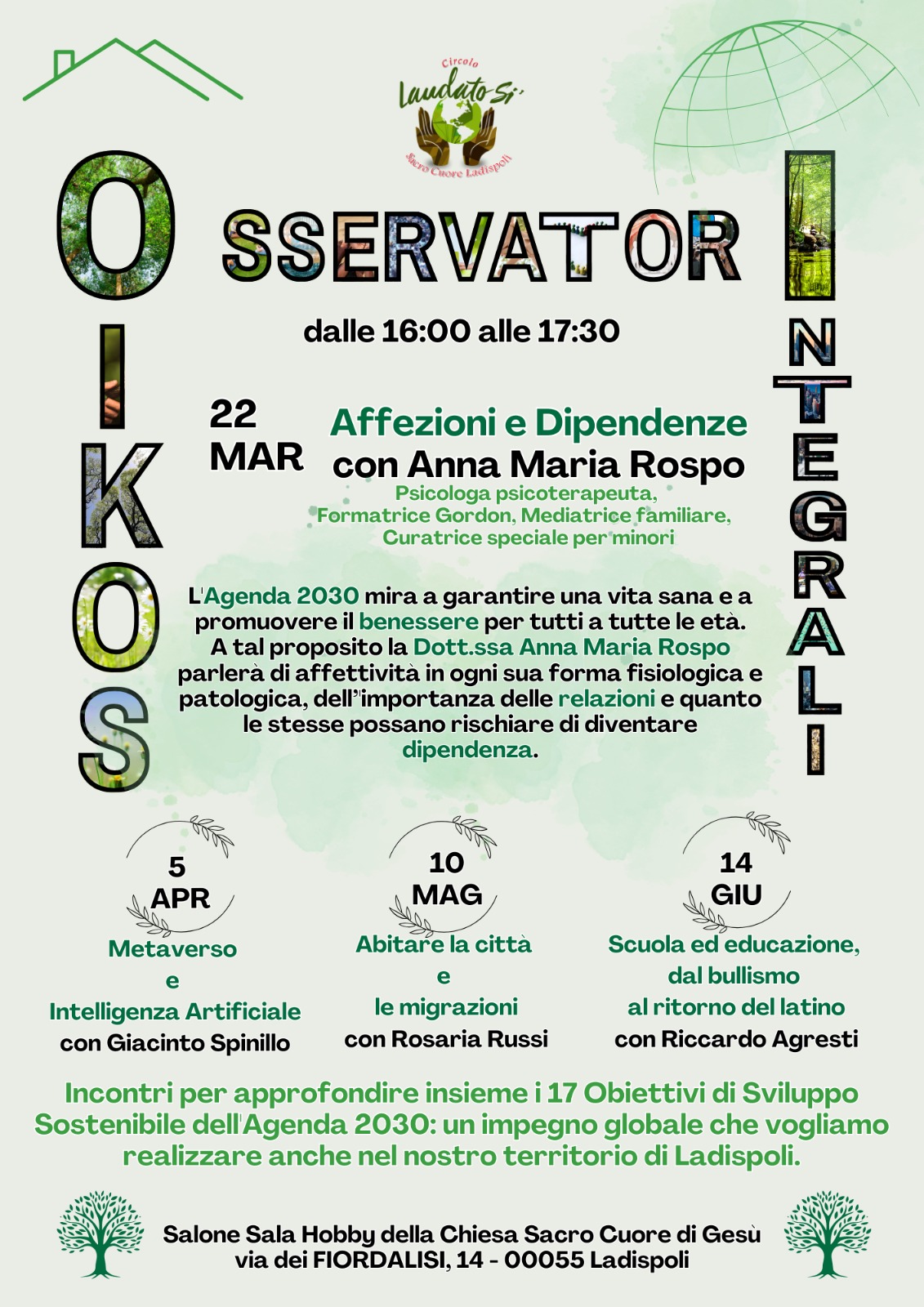 Il Circolo Laudato Si’ Sacro Cuore di Ladispoli invita la popolazione interessata a partecipare agli OSSERVATORI INTEGRALI dell’OIKOS, una serie di quattro incontri per approfondire gli Obiettivi di Sviluppo Sostenibile dell’Agenda 2030. Questi incontri offrono l’opportunità di riflettere su tematiche cruciali e di comprendere come anche la nostra comunità possa contribuire al cambiamento globale.