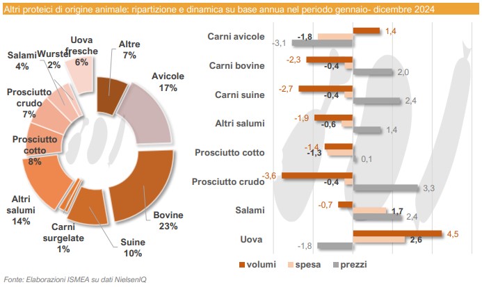 Nello specifico per le carni bovine la spesa si riduce dello 0,4% a fronte di una contrazione dei volumi del 2,3% (prezzi medi +2% vs 2023). Per le carni suine la spesa si riduce dello 0,4% a fronte di una contrazione dei volumi del 2,7%; per le carni avicole la situazione è leggermente differente, infatti, una produzione abbondante ha “favorito” un ridimensionamento dei prezzi (-3,1%) favorendo un recupero dei volumi (+1,4%) che compensa solo in parte le flessioni degli altri due comparti. La dinamica negativa che interessa tutte le carni non risparmia i salumi (-1,9% i volumi), tutti con prezzi in aumento (+1,4% in media), colpendo con maggior intensità quelli di valore unitario più alto (-3,6% i volumi di prosciutto crudo). Gli unici prodotti di origine animale ad incrementare la presenza nel carrello sono le uova, favorite rispetto agli altri prodotti del comparto dal basso costo a parità di apporto proteico; per le uova aumentano i volumi acquistati (+4,5%) con prezzi in flessione dell’1,8%, favoriti da promozioni volte a garantire l’assorbimento completo della produzione.