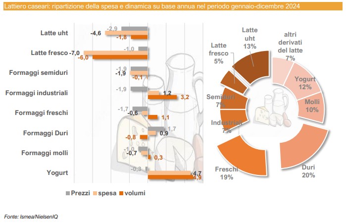 In lieve flessione la spesa per il comparto dei prodotti lattiero-caseari (-0,5%), all’interno del quale si riscontrano prezzi medi in ridimensionamento per tutti i prodotti ad eccezione dei formaggi duri per i quali i prezzi sono sostenuti dalle favorevoli condizioni della domanda dai paesi esteri, rafforzate nell’ultimo periodo dal timore dei dazi. Tornano ad essere apprezzati i formaggi “non stagionati” e nei carrelli degli italiani aumentano i volumi di formaggi industriali (+3,2%), di formaggi freschi (+1,1%), di formaggi molli (+0,3%) mentre flettono i volumi di duri (-0,8%) e restano per lo più stabili quelli dei semiduri (-0,1%). Le maggiori perdite in volume all’interno del comparto, si rilevano per il latte, che rappresenta oltre il 18% del valore comparto; in particolare, si continua ad evidenziare la flessione degli acquisti per il latte fresco per il quale la spesa si riduce del 7% (-6% i volumi e -1% i prezzi) in flessione, seppur meno marcata, anche gli acquisti di latte a lunga conservazione ( -4,6% la spesa e -1,8% i volumi). La colazione degli italiani vede in parte sostituire questo prodotto con lo yogurt, per il quale si rileva invece un incremento degli acquisti in volume del 4,9% (+4,7% la spesa).