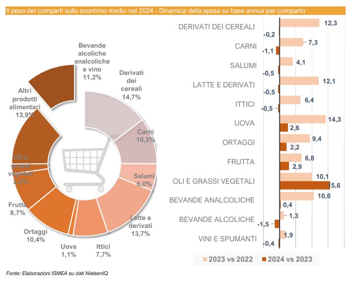 Nel 2024, dopo oltre due anni di crescita, si registrano contrazioni nella spesa per i prodotti proteici di origine animale: carni (-1,1%), lattiero-caseari (-0,5%), salumi (-0,5%) e ittici (-0,5%). Tuttavia, le uova sono un’eccezione, con un aumento del +2,6%. La spesa per ortofrutticoli continua a crescere (+2,2% per gli ortaggi e +2,9% per la frutta), così come gli oli vegetali (+15,6%), anche se con un rallentamento. La spesa per i derivati dei cereali è quasi stabile (-0,2%), con crescita per “pane e sostituti” (+1,4%) e “pasta fresca” (+2,4%), ma una flessione per pasta secca (-6,1%) e riso (-4,8%). I “vini e spumanti” sono sostanzialmente stabili (-0,4%), mentre le bevande analcoliche segnano un modesto aumento (+0,4%).