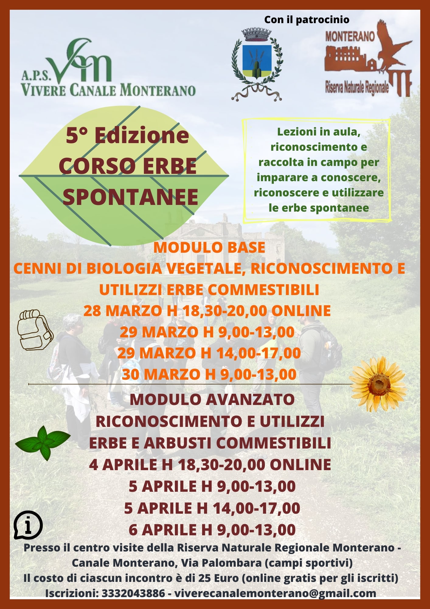 L’associazione Vivere Canale Monterano APS, con il patrocinio del Comune di Canale Monterano e della Riserva Naturale Regionale Monterano, organizza la quinta edizione del corso sul riconoscimento delle erbe spontanee commestibili, divenuto ormai un punto di riferimento per il territorio e non solo, che ha visto negli anni una crescente adesione di partecipanti provenienti da ogni angolo del Lazio.