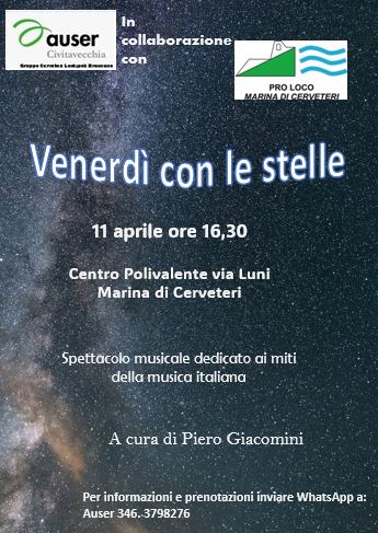 L’appuntamento è per venerdì 11 aprile alle ore 16:30. L’ingresso all’evento, organizzato insieme a Piero Giacomini della Pro Loco Marina di Cerveteri, è gratuito ed aperto a tutti. I non iscritti all’Associazione Auser potranno ugualmente parteciparvi, lasciando i propri contatti o avvisando l’organizzazione inviando un messaggio whatsapp al numero 3463798276.