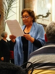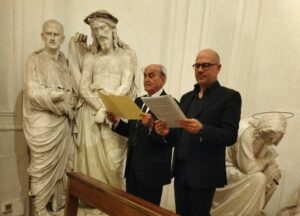 “La madre addolorata era ai piedi della croce cui era appeso il figlio”, questo l’incipit del testo, letto magistralmente da Carla Maglione, attribuito a Jacopo dei Benedetti (Jacopone da Todi), il frate, scomunicato da Bonifacio VIII che “impazzito d’amore per Cristo, con la sua arte nuova si prese gioco del Mondo e si conquistò il Cielo”.