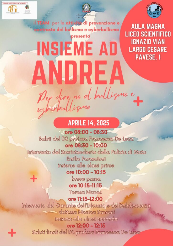 La dirigente scolastica dell’Istituto “Ignazio Vian”, Francesca De Luca, ha aperto con i saluti istituzionali la conferenza del 14 aprile dal titolo “INSIEME AD ANDREA. Per dire no al bullismo e cyberbullismo”. L’incontro, che ha coinvolto le classi prime e seconde, si è tenuto nell’Aula Magna dell’Istituto dove si sono alternati due relatori d’eccellenza, Emilio Farascioni e Teresa Manes, che hanno incantato i ragazzi narrando le loro esperienze con il cuore. Emilio Farascioni, sovrintendente della Polizia di Stato, in servizio nella polizia postale, ha in attivo un’esperienza trentennale, ha incontrato almeno 60,000 alunni che lo hanno reso ottimo conoscitore di storie vissute, storie di dolore e di problemi derivanti da internet e dai social. Ha raccontato in modo coinvolgente, con un linguaggio ricco di gag, di aneddoti, di frasi interrogative e figure retoriche i comportamenti più comuni agiti dai giovani durante la navigazione in internet e nei social. Ciò ha stimolato la condivisione e mantenuto alto il livello di attenzione e riflessione sul fatto che un poco alla volta stiamo tutti mettendo la nostra vita on line. Lo sanno bene le grandi aziende che, anche a distanza di anni, quando ricevono i curriculi per richieste di lavoro, fanno una ricerca del comportamento pregresso tenuto dal candidato sui social. Lo sanno bene ladri e truffatori che rischiamo di ritrovarci in casa perché utilizzano i post che ci mostrano in vacanza o perché sono attratti dall’immagine di un dono prezioso che abbiamo postato orgogliosamente.