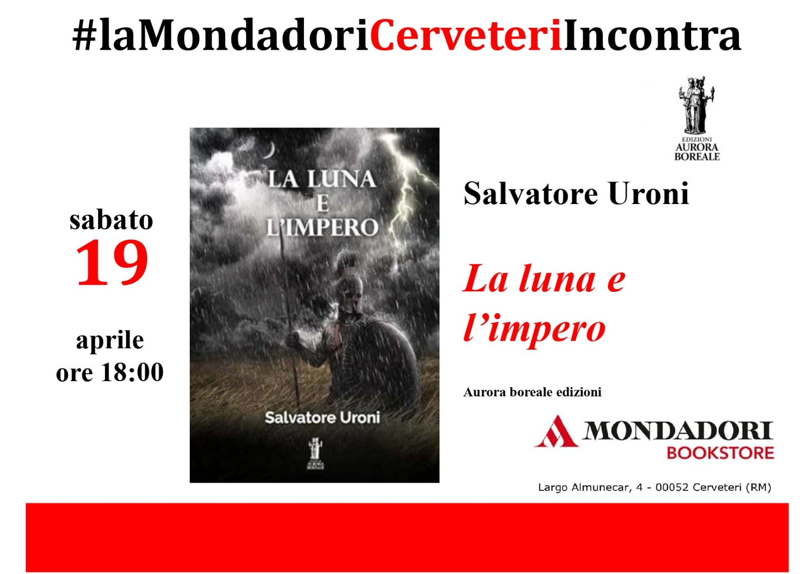 Terzo appuntamento del mese di Aprile della rassegna #laMondadoriCerveteriIncontra. Sabato 19 aprile alle ore 18:00, la Mondadori Bookstore di Cerveteri di Andrea Oliva e Tarita Vecchiotti, sono pronte ad ospitare Salvatore Uroni, autore residente a Cerveteri, che presenterà la sua ultima fatica letteraria, ovvero “La luna e l’impero”, edito da Aurora Boreale Edizioni.
