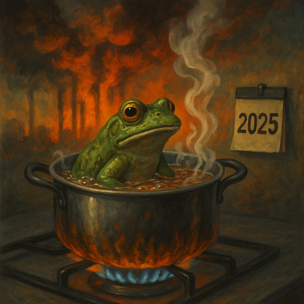 Quando penso alla crisi climatica in cui ci siamo cacciati, sovente mi viene in mente la storia della rana bollita. La riassumo per chi non la conoscesse: in un pentolone pieno d’acqua fredda una rana nuota tranquillamente. Il fuoco è acceso sotto la pentola, l’acqua si riscalda pian piano; diventa tiepida, e la rana la trova piuttosto gradevole. Col passare del tempo la temperatura sale, la rana apprezza questo calore. Dopo un po’ però inizia a stancarsi, ma non si spaventa. L’acqua adesso è davvero troppo calda e la rana la trova molto sgradevole, ma si è indebolita, non ha la forza di reagire; allora sopporta e non fa nulla. Intanto la temperatura sale ancora, fino al momento in cui la rana finisce bollita.