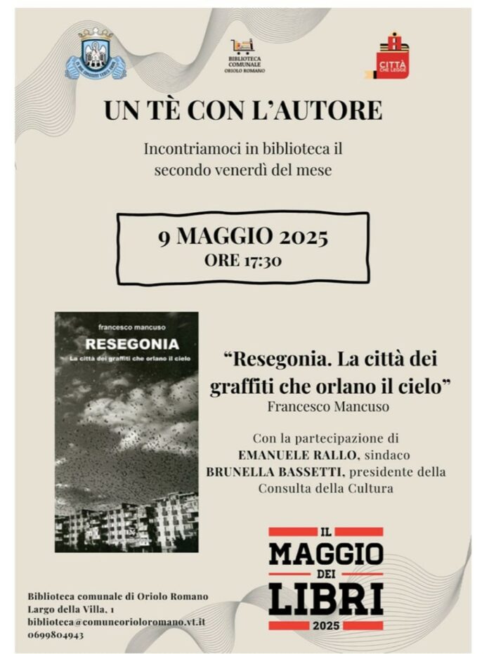 La biblioteca comunale di Oriolo, nell’ambito della rassegna “Un tè con l’autore” per il “Maggio dei libri”, invita all’evento per la presentazione dell’ultimo libro di Francesco Mancuso, che si terrà