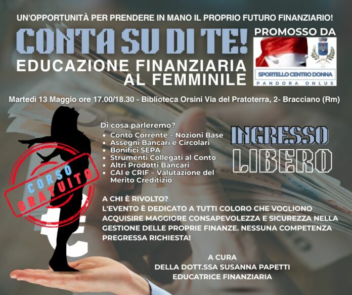 Sarà tenuto dalla dott.ssa Susanna Papetti, educatrice finanziaria, martedì 13 maggio, dalle 17,00 alle 18,30, nella Biblioteca Bartolomea Orsini di Bracciano.
