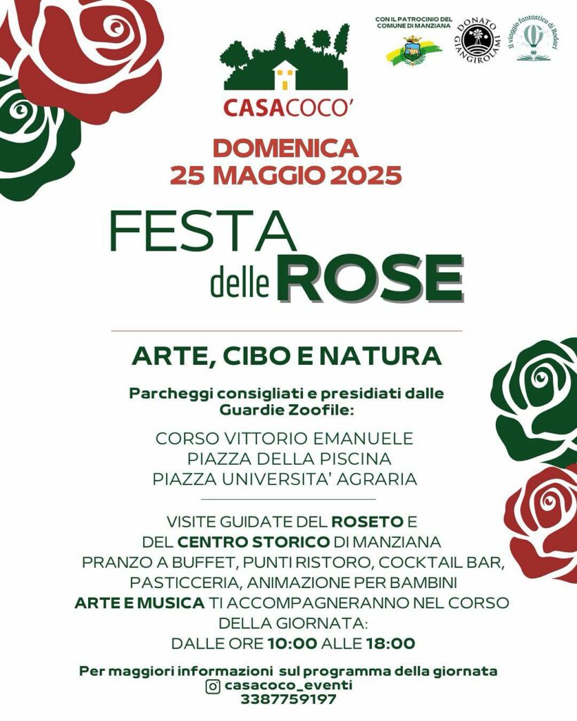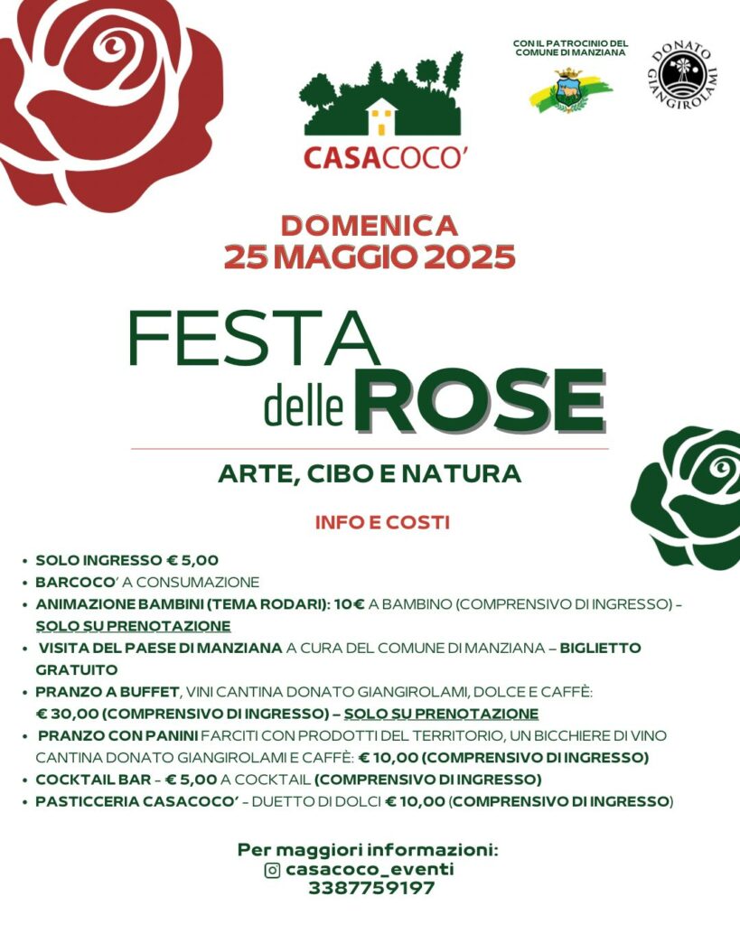 La Festa delle Rose, promossa da Casacocò all’insegna dell’arte, del cibo, della natura, si terrà nella intera giornata del 25 Maggio, dalle ore 10,00 alle 18, si articolerà in diversi momenti trascorsi tra arte e musica: visite guidate del roseto e del centro storico, pranzo a buffet, animazione per bambini.