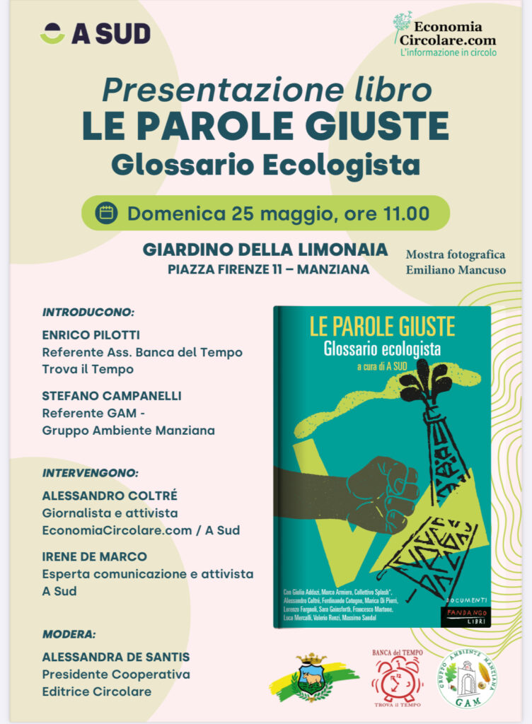 La Banca del Tempo di Manziana, il 25 maggio alle ore 11,00, nel Giardino della Limonaia, in Piazza Firenze, 11, presenterà il libro glossario ecologista, “Le parole giuste”