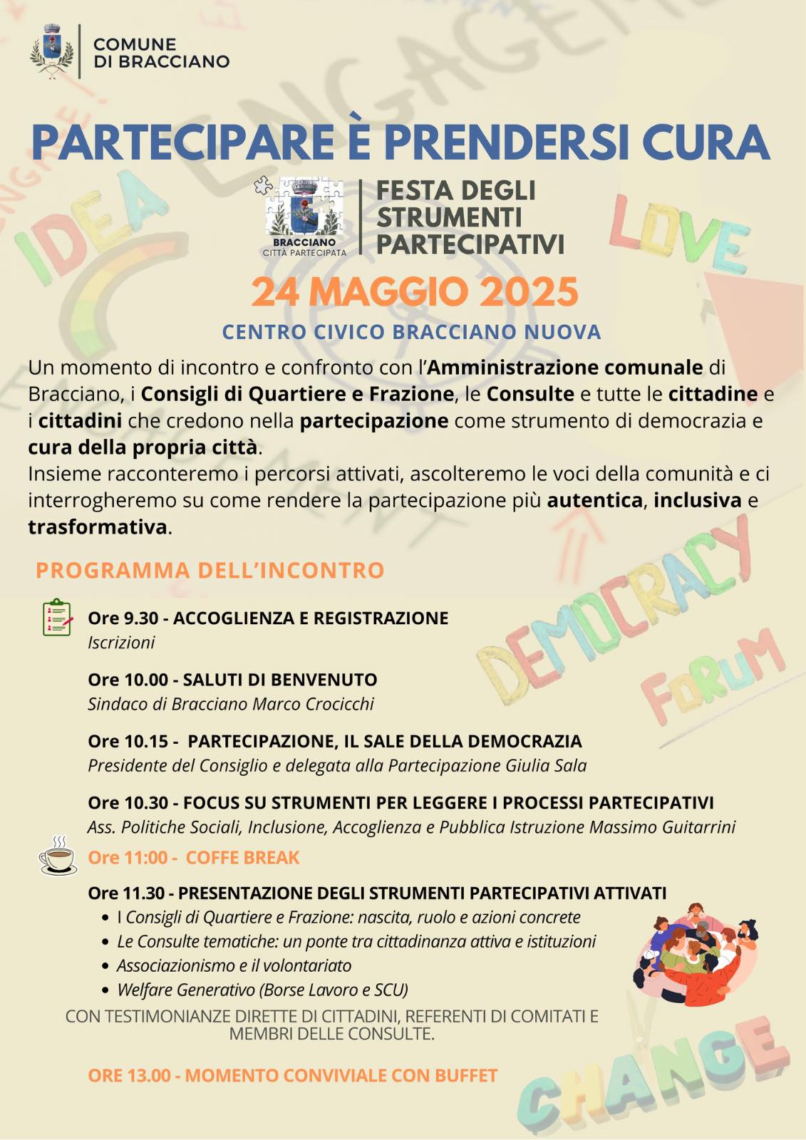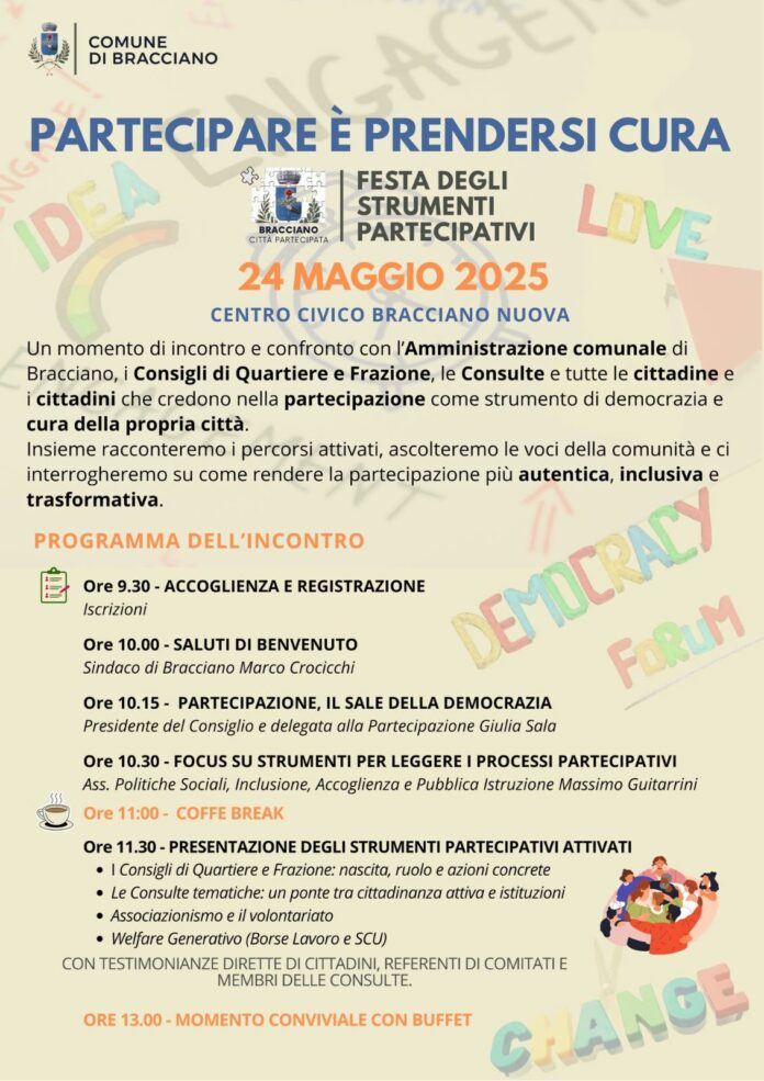 Sabato 24 maggio presso il Centro Civico di Bracciano si terrà la Festa degli strumenti partecipativi a partire alle 9:30.