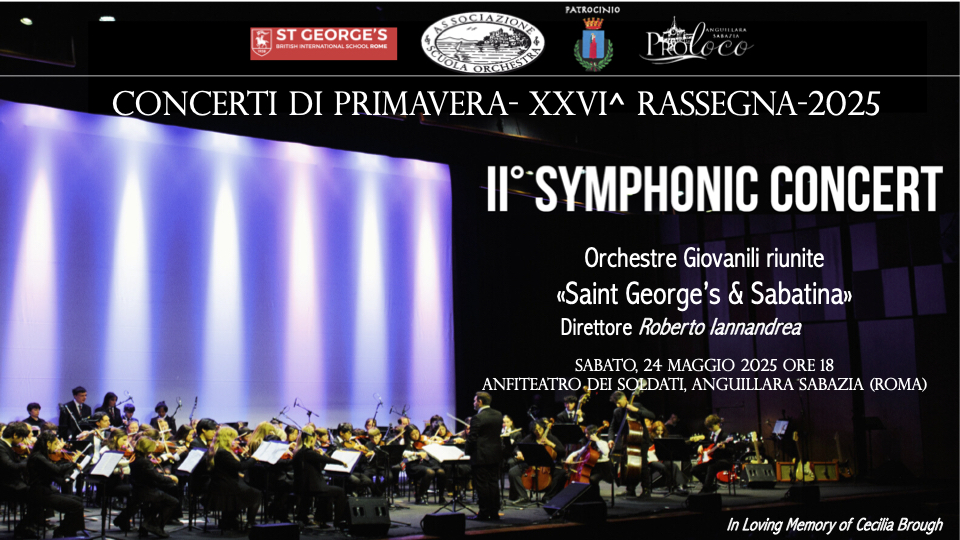 L’Associazione Scuola Orchestra ha dato vita all’Orchestra Giovanile Sabatina”, diretta dal maestro Roberto Iannandrea. Per il suo primo anno è ancora un piccolo nucleo, che, insieme all’ orchestra giovanile della St George’s British International School, parteciperà al “CONCERTO SINFONICO “ diretto da Roberto Iannandrea,
