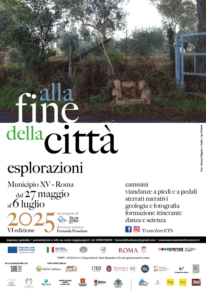 “Alla fine della città”, un progetto Ti con Zero Ets, direzione artistica Fernanda Pessolano, è un approccio multidisciplinare arricchito da azioni innovative e dalla rilettura delle aree naturali e storico-artistiche, che interpreta il contemporaneo attraverso spettacoli itineranti, performance di danza, sentieri di arte e natura, reportage e intuizioni, seminari di pratica somatica e formazione itinerante delle arti del teatro di figura, fotografiche e narrative. Si va verso la periferia del Municipio XV camminando, pedalando, testimoniando, e si torna in città confidando, confessando, ricordando. Due mondi diversi, che viaggiano a tempi e ritmi diversi, che si specchiano e si riflettono così diversi, ma che si relazionano, si confrontano, si contattano nella loro profonda spiritualità.